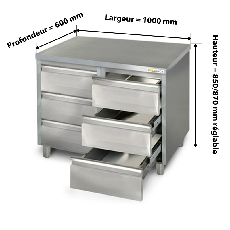 Le meuble tiroirs en acier inoxydable de marque GOLDINOX® s’adaptera parfaitement à votre établissement afin d’aménager au mieux votre espace de travail.