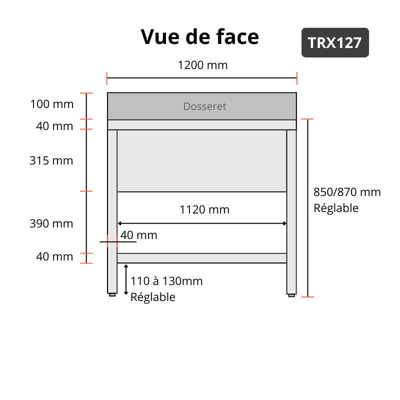 Les pieds carrés apportent une stabilité irréprochable, et grâce à leur réglage en hauteur de 850 mm à 870 mm, la plonge s’adapte parfaitement à votre confort de travail, réduisant la fatigue lors d’utilisations prolongées.