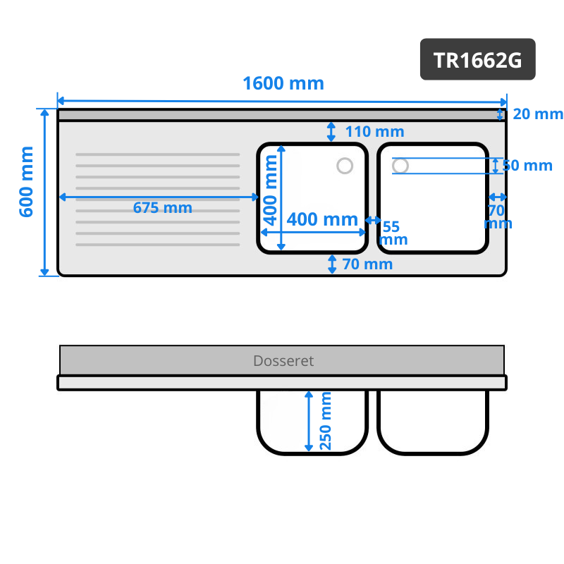 Plonge inox 2 bacs - 1600 x 600 mm égouttoir gauche ECO / GOLDINOX