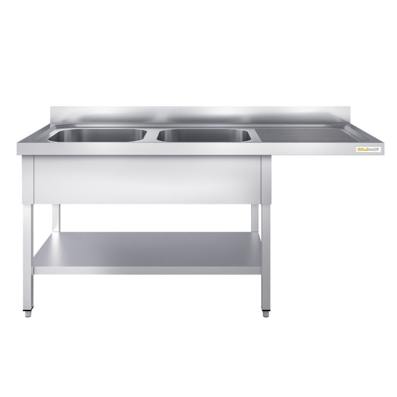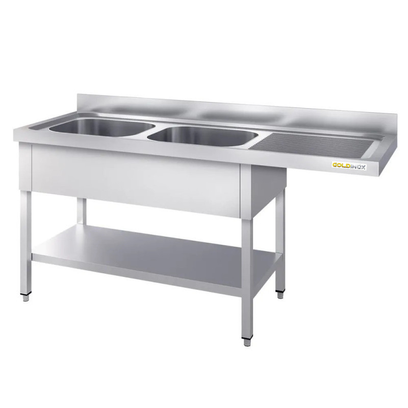 La plonge lave-vaisselle GOLDINOX IDEAL avec ses 2 bacs et son égouttoir à droite représente l'équilibre parfait entre qualité, fonctionnalité et durabilité pour les professionnels de la restauration et de l'hôtellerie.