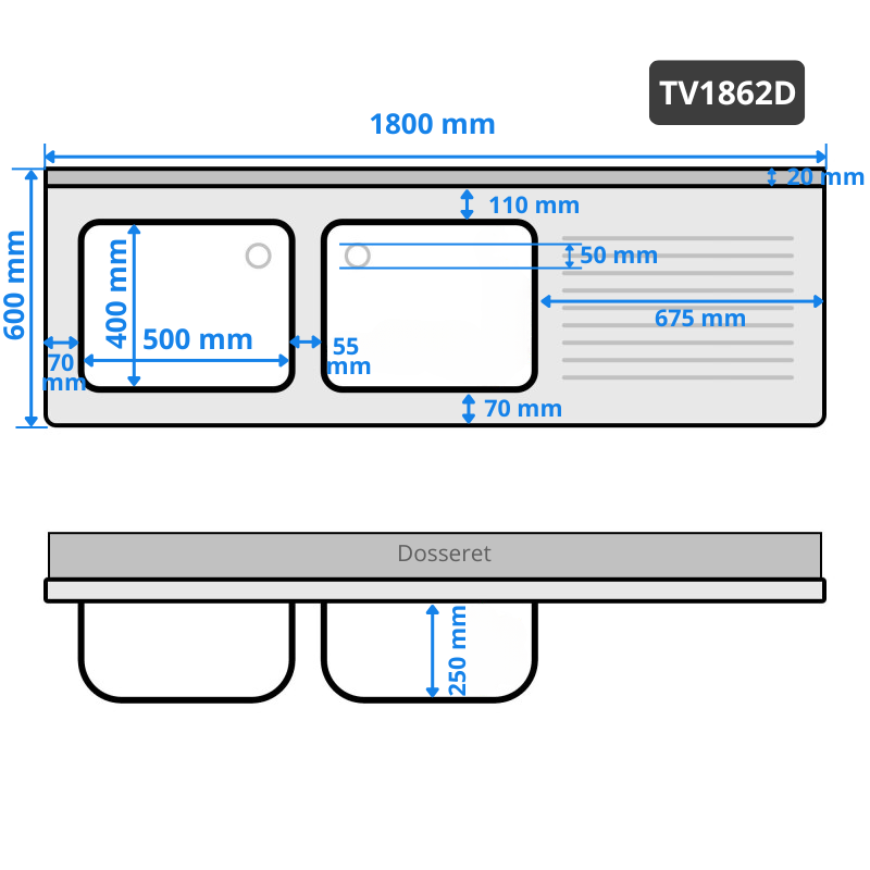 - Dimensions totales : 1800 x 600 x 850/870mm (LxPxH)