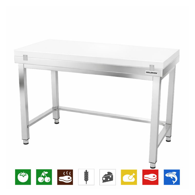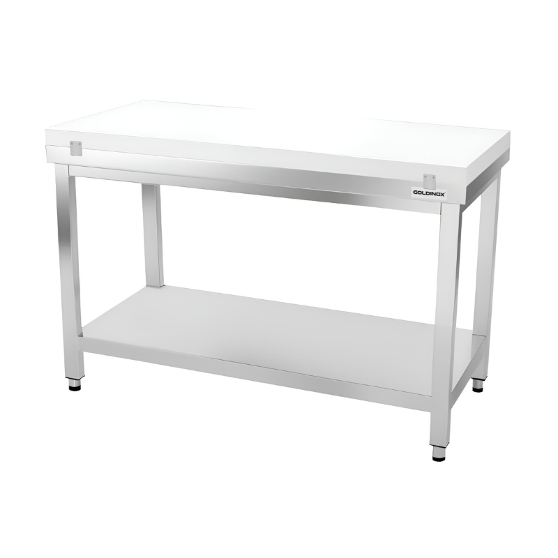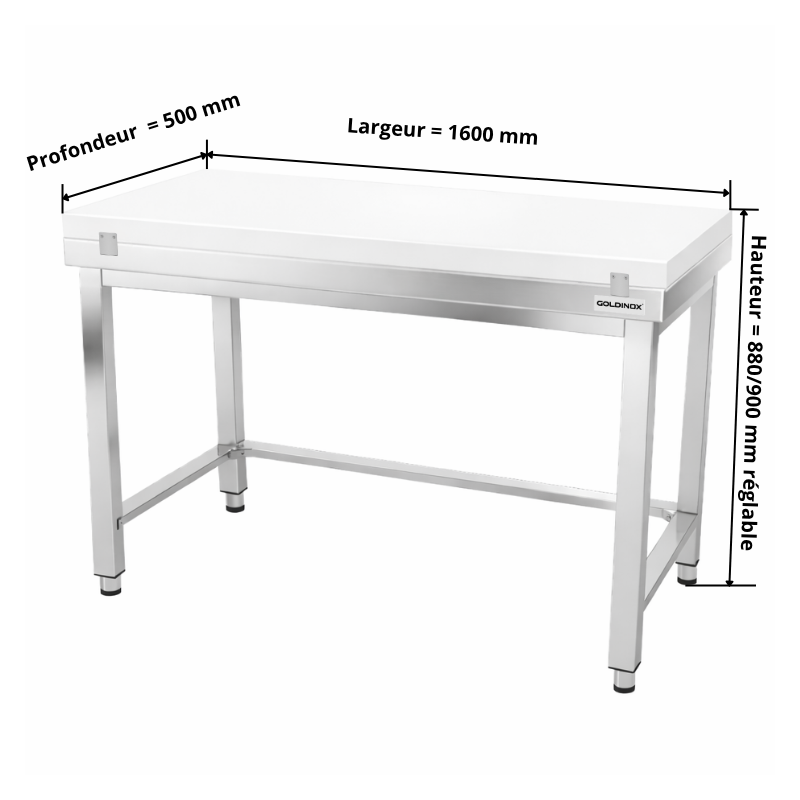 Table de travail en inox 1600x500 mm avec plaque de découpe blanche et renfort PREMIUM - GOLDINOX