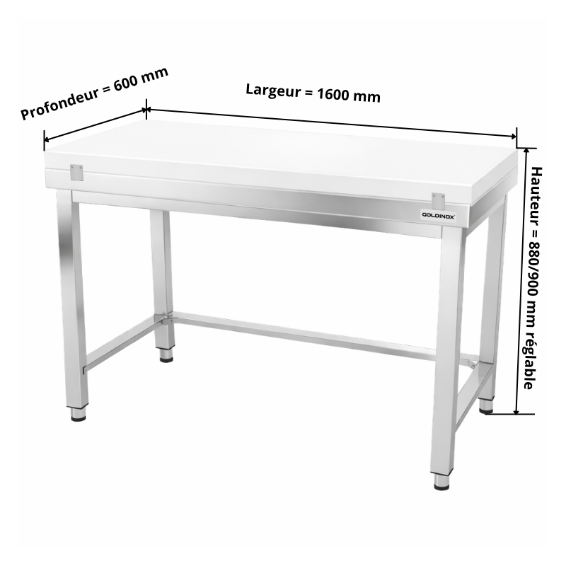 Table de travail en inox 1600x600 mm avec plaque de découpe blanche et renfort PREMIUM - GOLDINOX