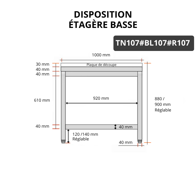 - Possibilité d'ajouter en option une étagère supplémentaire (E107) ou un kit roulettes (RLT4)