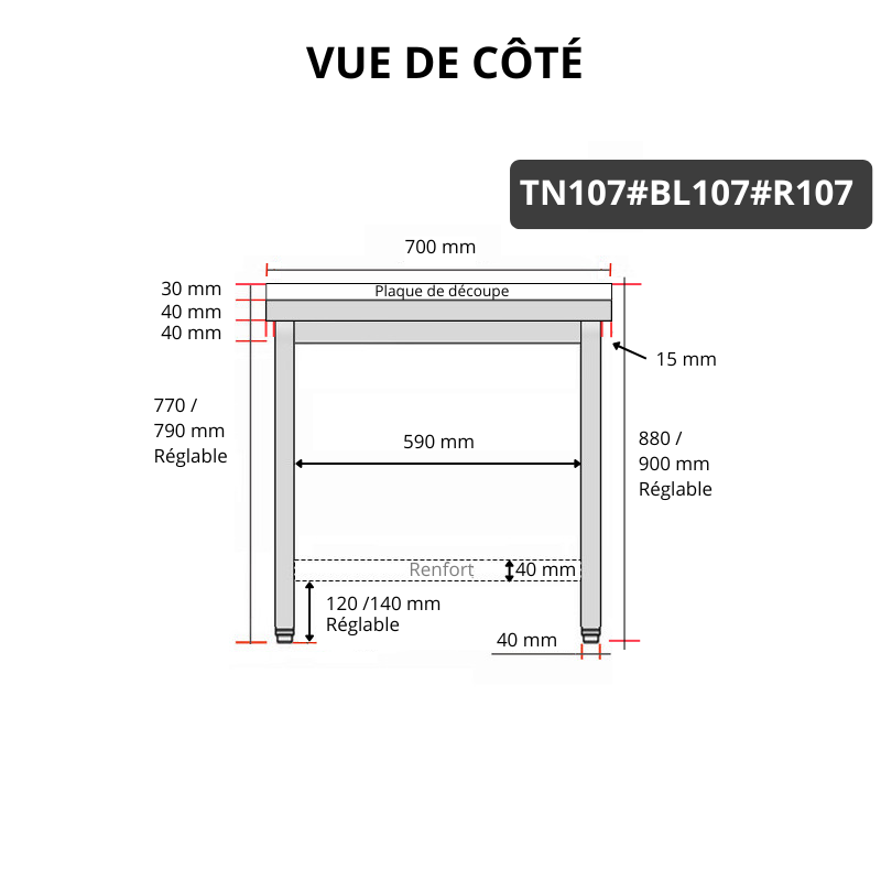 - Pieds de table carrés réglables en hauteur de 880 à 900 mm