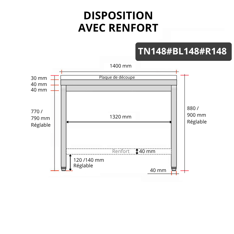- Pieds de table carrés réglables en hauteur de 880 à 900 mm