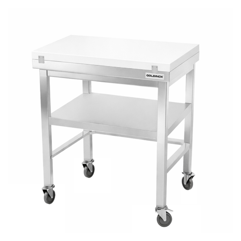 Table de travail en inox 600x600 mm avec plaque de découpe blanche et renfort sur roulettes PREMIUM - GOLDINOX
