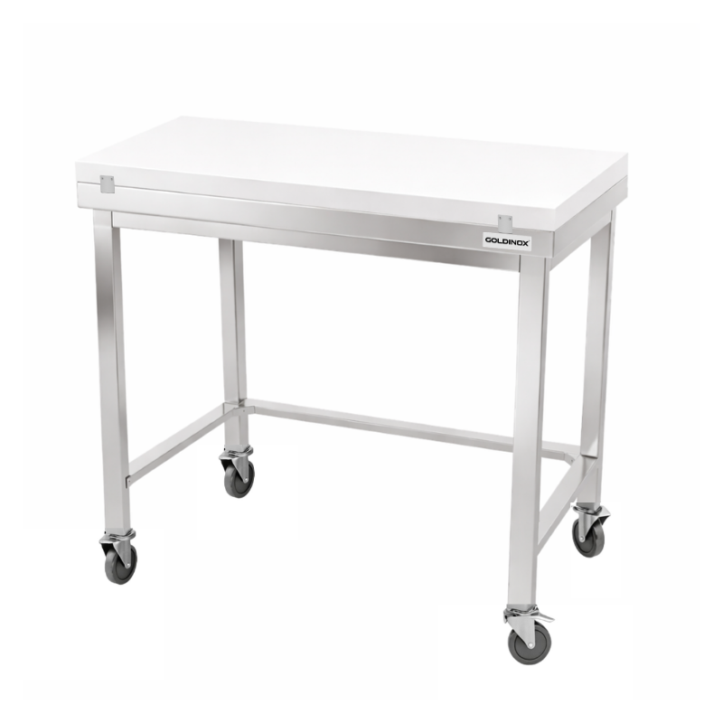 Table de travail en inox 1200x600 mm avec plaque de découpe blanche et renfort sur roulettes PREMIUM - GOLDINOX