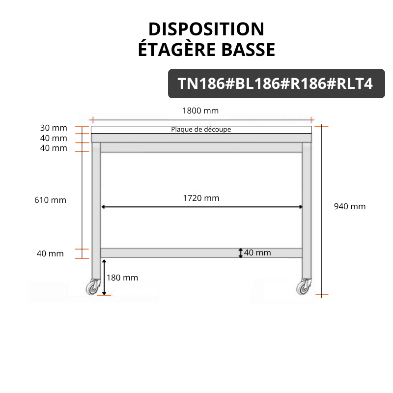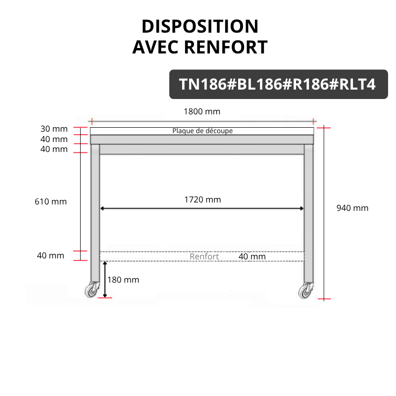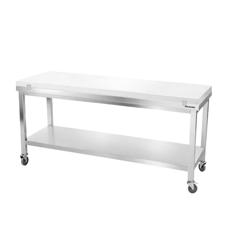Table de travail en inox 1800x600 mm avec plaque de découpe blanche et renfort sur roulettes PREMIUM - GOLDINOX