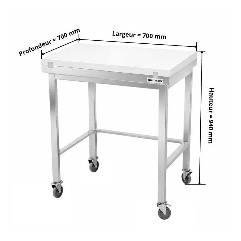Table de travail en inox 700x700 mm avec plaque de découpe blanche et renfort sur roulettes PREMIUM - GOLDINOX