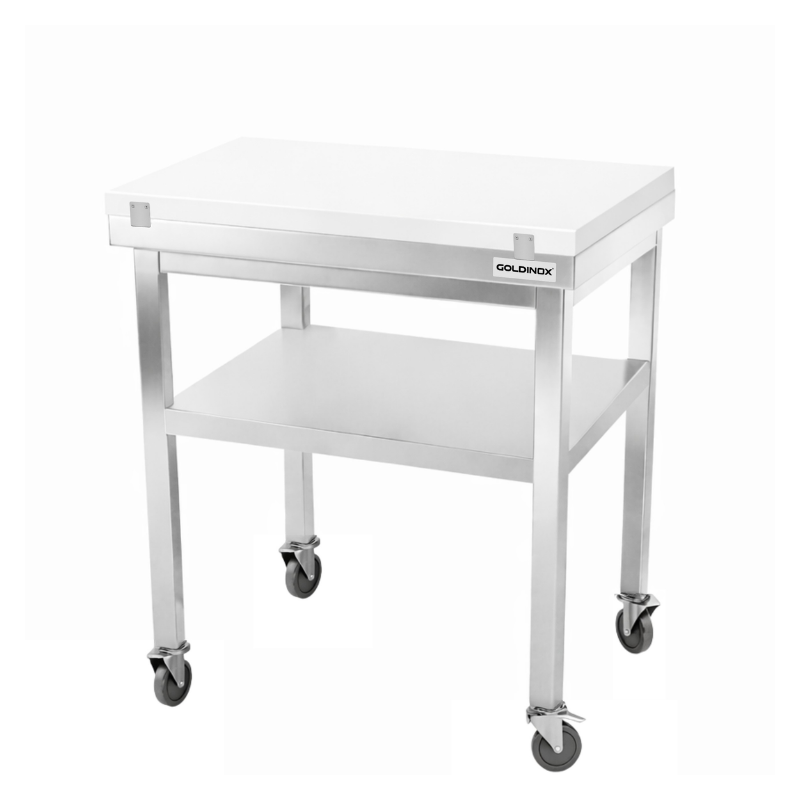 Table de travail en inox 800x700 mm avec plaque de découpe blanche et renfort sur roulettes PREMIUM - GOLDINOX