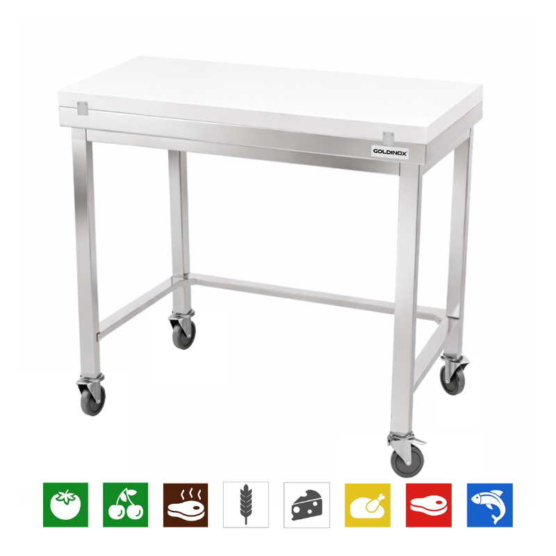 Table de travail en inox 1000x700 mm avec plaque de découpe blanche et renfort sur roulettes PREMIUM - GOLDINOX