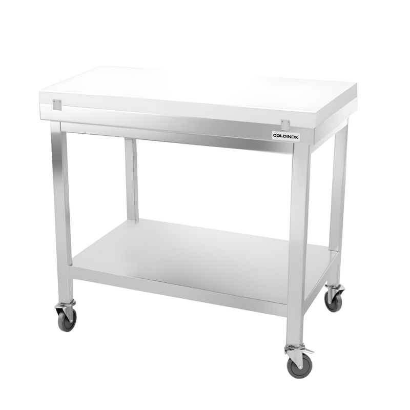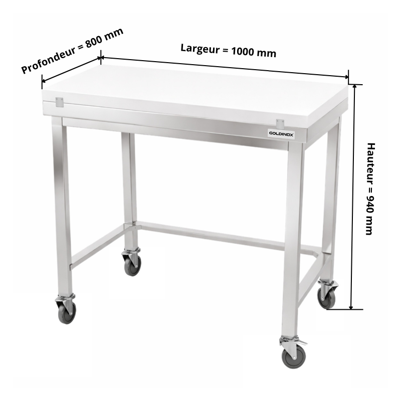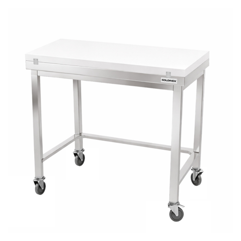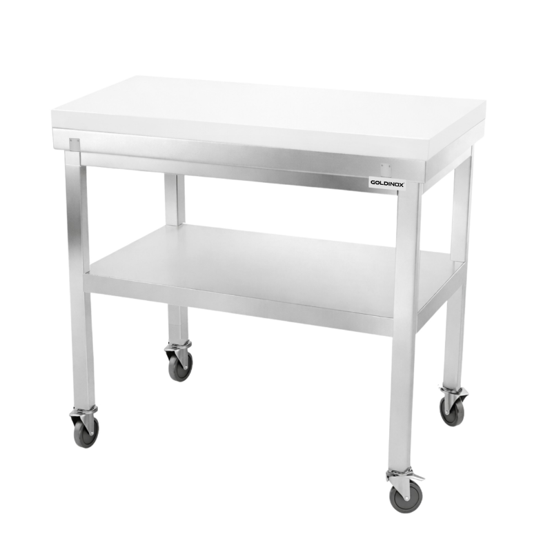 Table de travail en inox 1000x800 mm avec plaque de découpe blanche et renfort sur roulettes PREMIUM - GOLDINOX