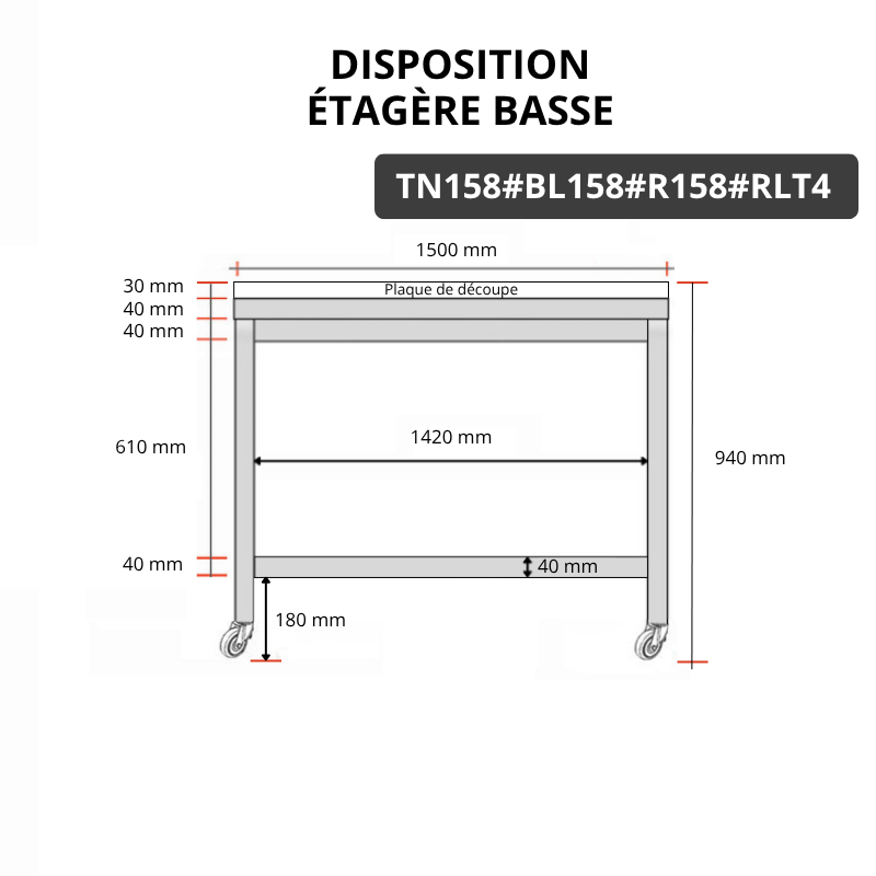 Table de travail en inox 1500x800 mm avec plaque de découpe blanche et renfort sur roulettes PREMIUM - GOLDINOX