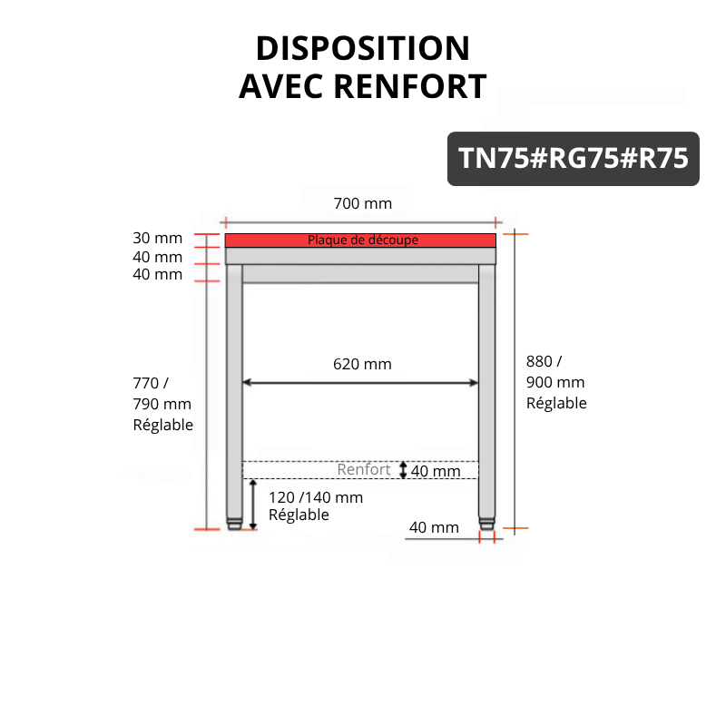 Table de travail en inox 700x500 mm avec plaque de découpe rouge et renfort PREMIUM - GOLDINOX