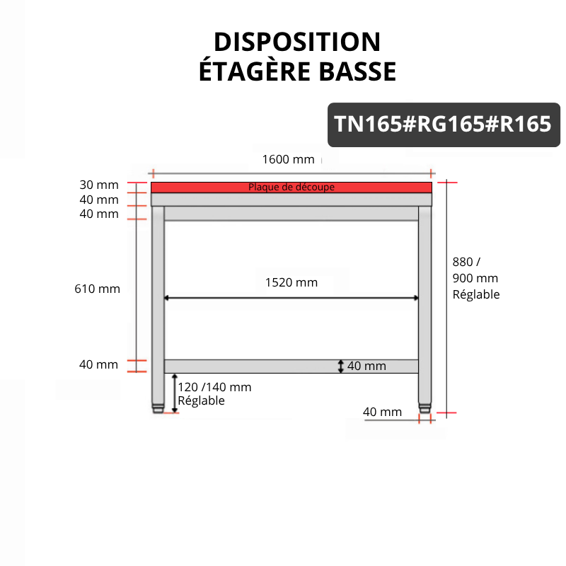 Table de travail en inox 1600x500 mm avec plaque de découpe rouge et renfort PREMIUM - GOLDINOX