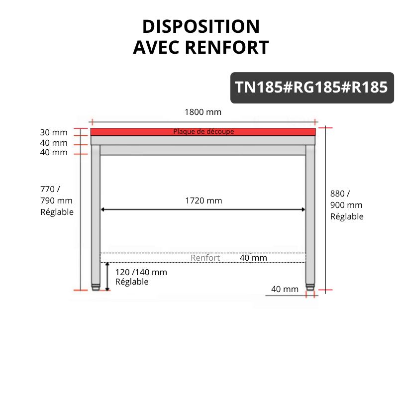 Table de travail en inox 1800x500 mm avec plaque de découpe rouge et renfort PREMIUM - GOLDINOX