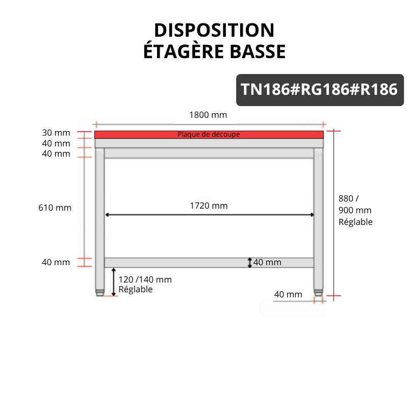Table de travail en inox 1800x600 mm avec plaque de découpe rouge et renfort PREMIUM - GOLDINOX
