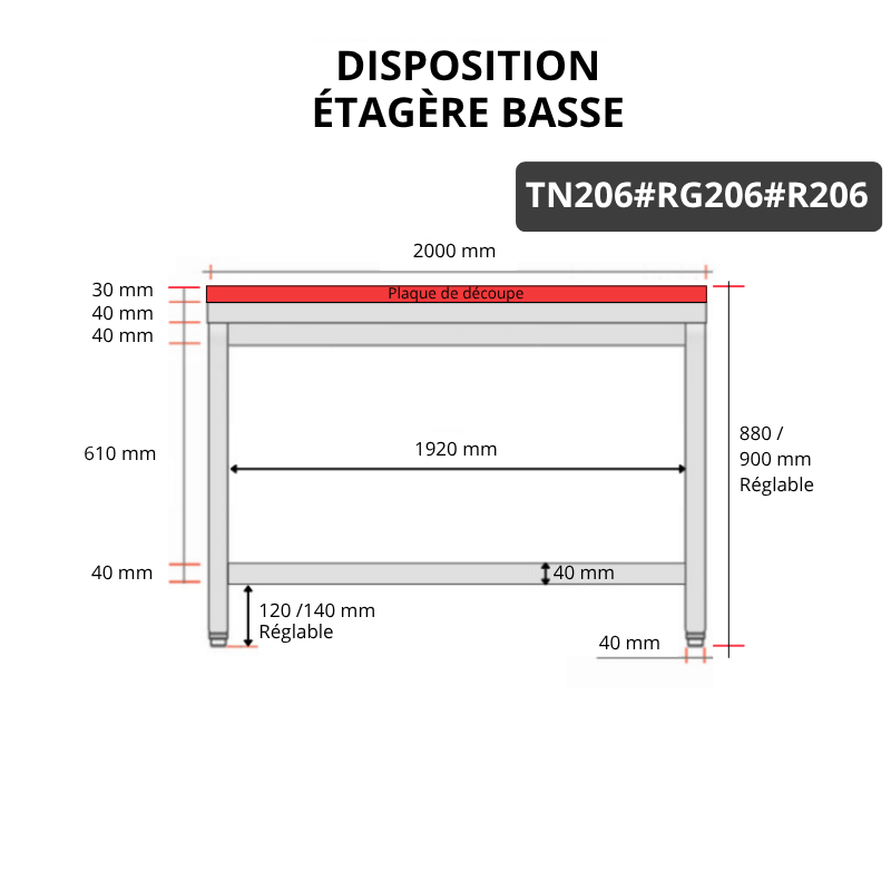 Table de travail en inox 2000x600 mm avec plaque de découpe rouge et renfort PREMIUM - GOLDINOX