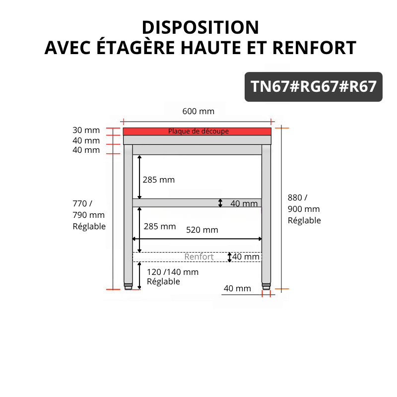 Table de travail en inox 600x700 mm avec plaque de découpe rouge et renfort PREMIUM - GOLDINOX