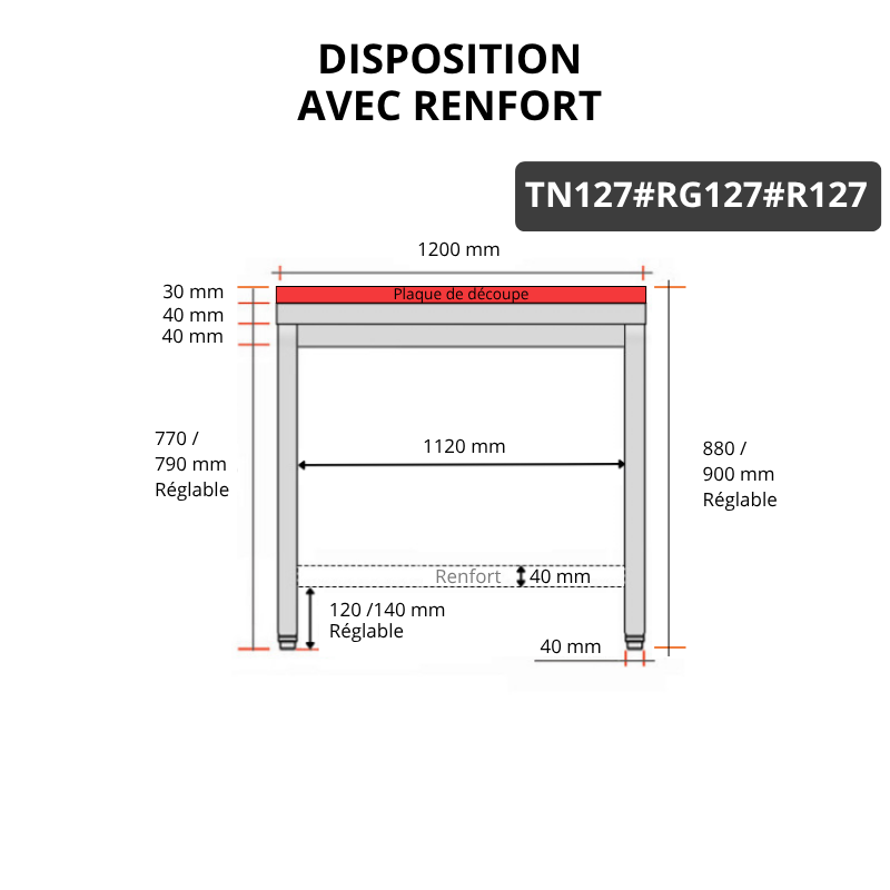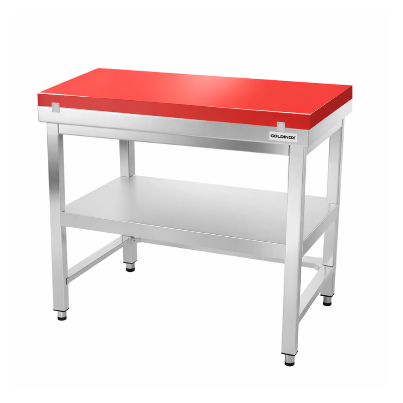 Table de travail en inox 1200x700 mm avec plaque de découpe rouge et renfort PREMIUM - GOLDINOX