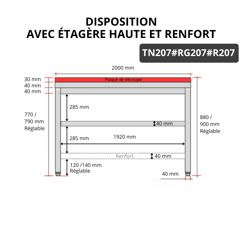 Table de travail en inox 2000x700 mm avec plaque de découpe rouge et renfort PREMIUM - GOLDINOX