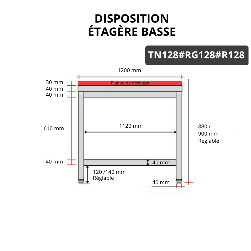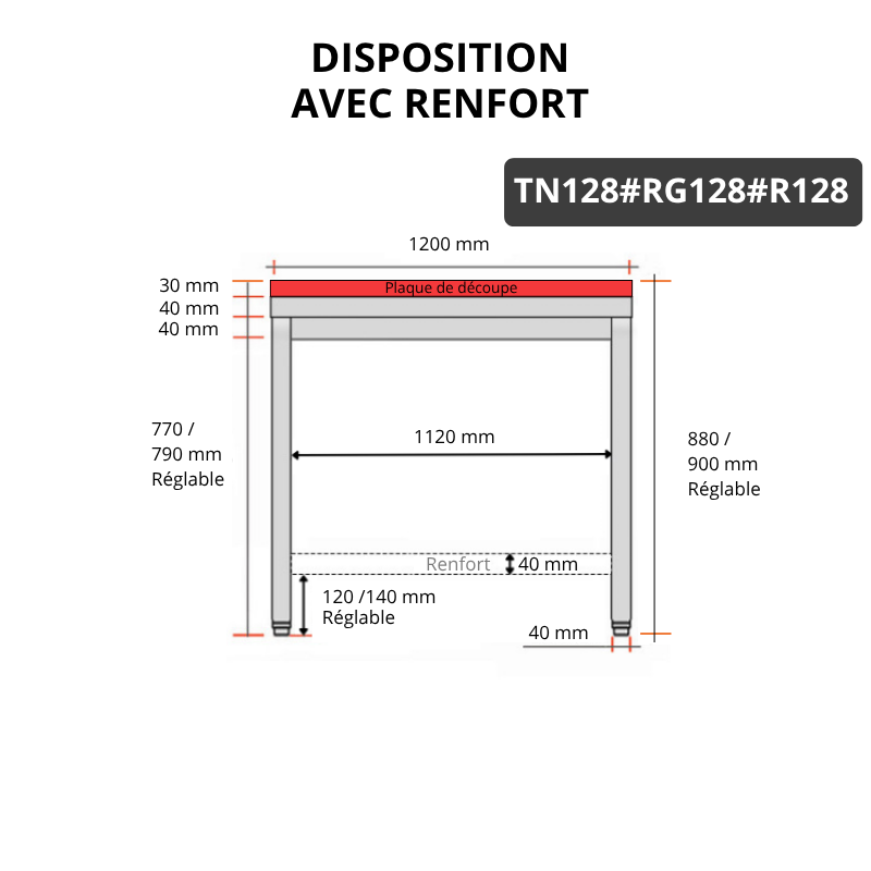 Table de travail en inox 1200x800 mm avec plaque de découpe rouge et renfort PREMIUM - GOLDINOX