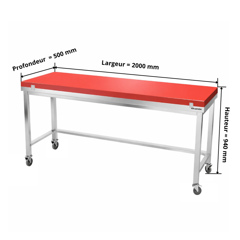 Table de travail en inox 2000x500 mm avec plaque de découpe rouge et renfort sur roulettes PREMIUM - GOLDINOX