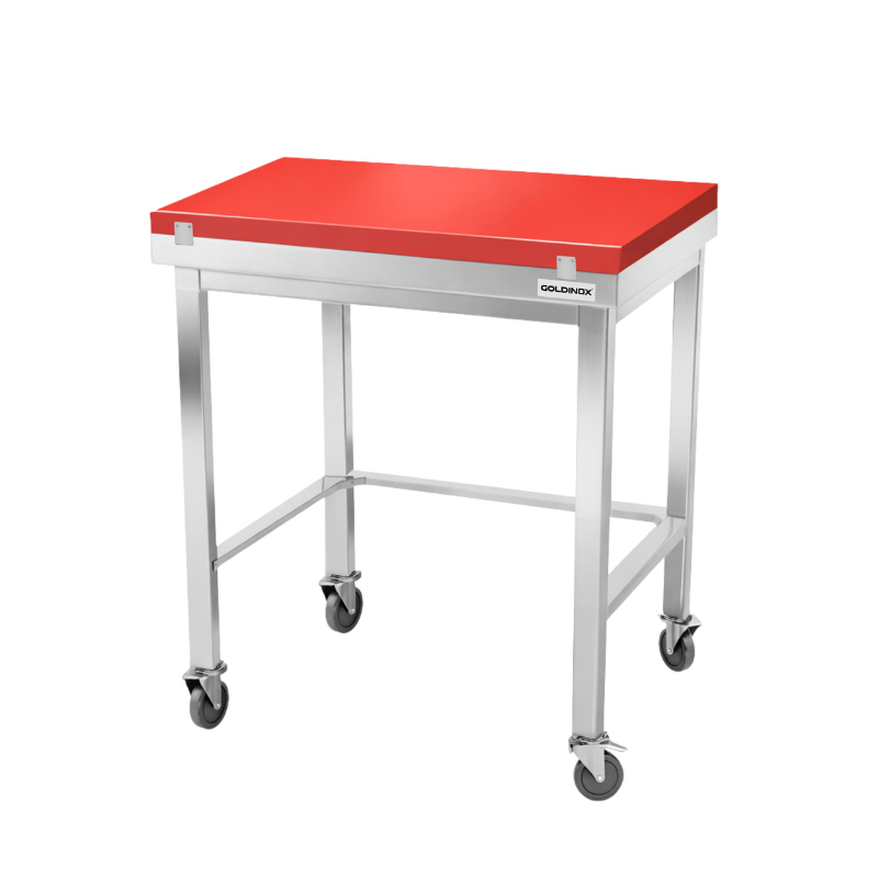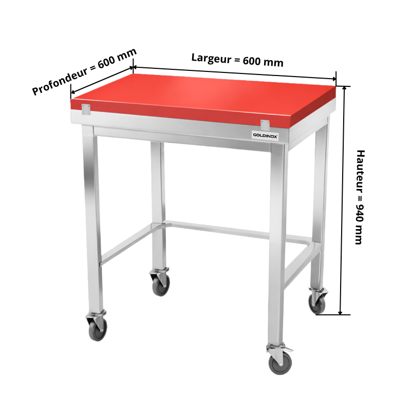 Table de travail en inox 600x600 mm avec plaque de découpe rouge et renfort sur roulettes PREMIUM - GOLDINOX