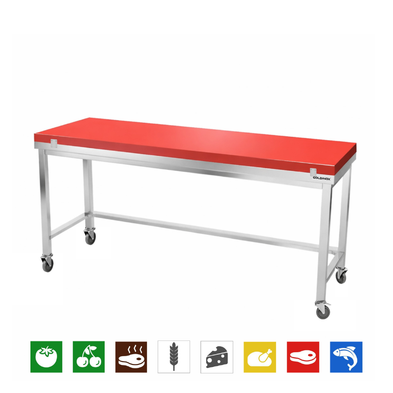Table de travail en inox 1800x600 mm avec plaque de découpe rouge et renfort sur roulettes PREMIUM - GOLDINOX