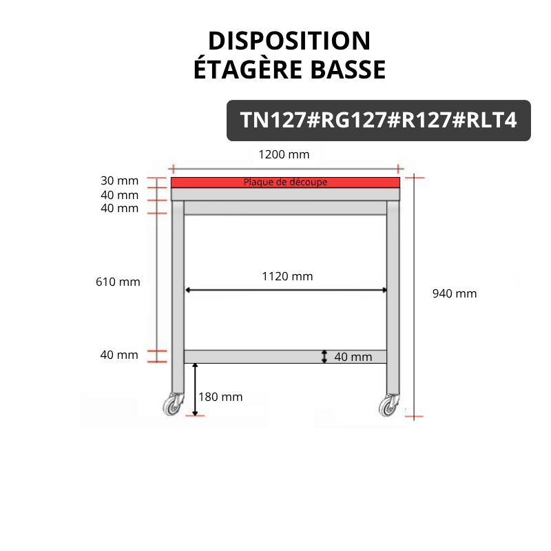 Table de travail en inox 1200x700 mm avec plaque de découpe rouge et renfort sur roulettes PREMIUM - GOLDINOX