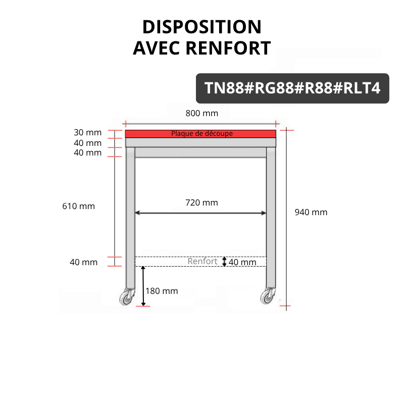 Table de travail en inox 800x800 mm avec plaque de découpe rouge et renfort sur roulettes PREMIUM - GOLDINOX