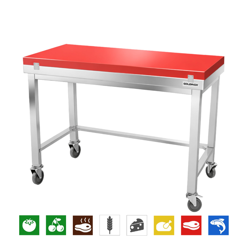 Table de travail en inox 1200x800 mm avec plaque de découpe rouge et renfort sur roulettes PREMIUM - GOLDINOX