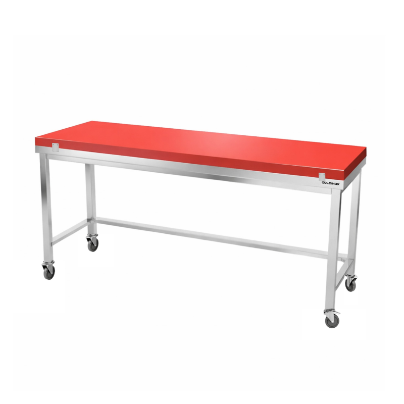 Table de travail en inox 1800x800 mm avec plaque de découpe rouge et renfort sur roulettes PREMIUM - GOLDINOX