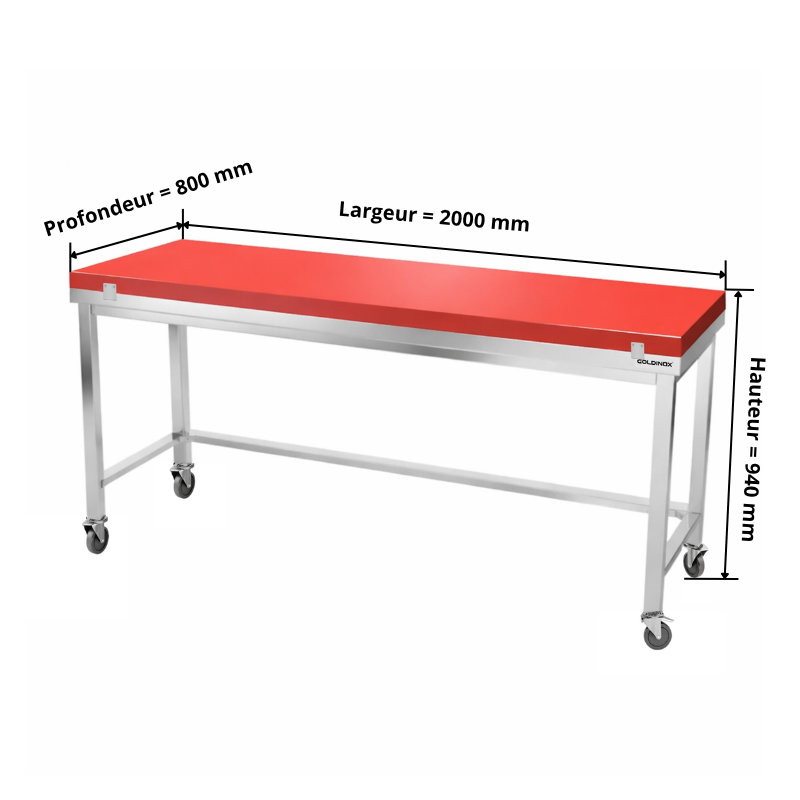 Table de travail en inox 2000x800 mm avec plaque de découpe rouge et renfort sur roulettes PREMIUM - GOLDINOX