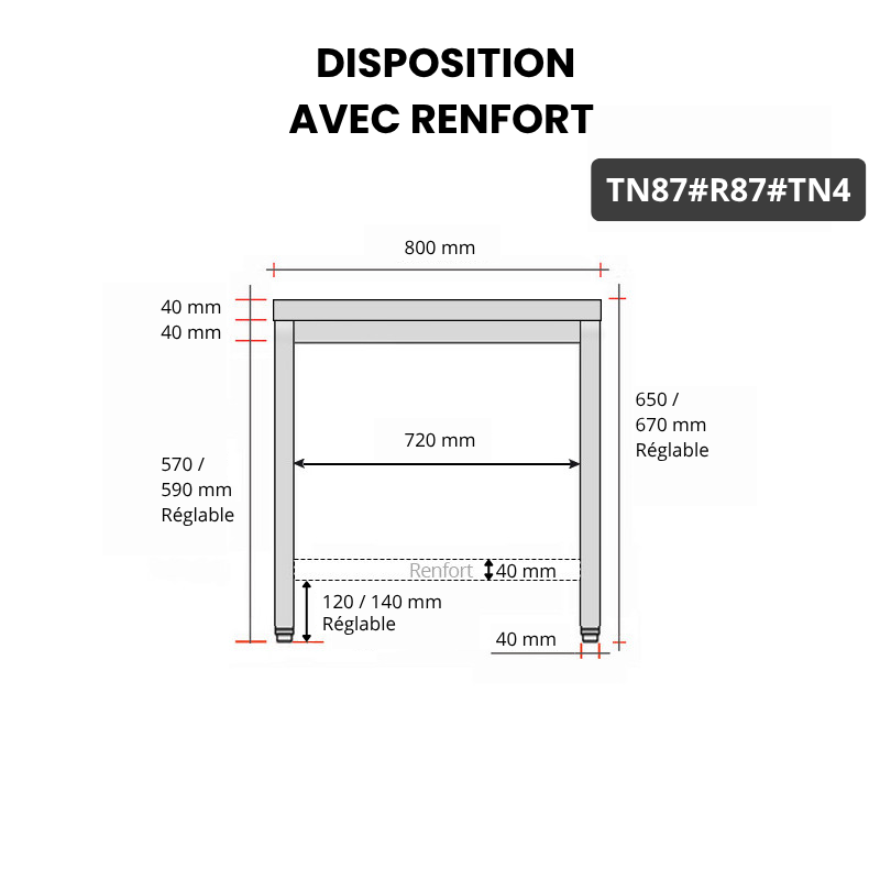 Table inox soubassement 800 x 700 mm avec renfort / GOLDINOX
