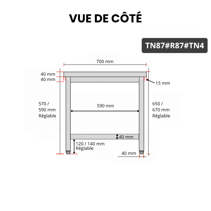 - Pieds réglables : 660 à 680 mm