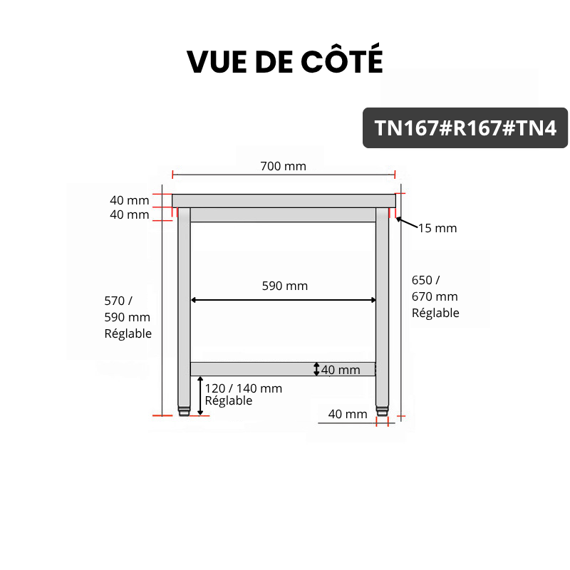 - Pieds réglables : 660 à 680 mm