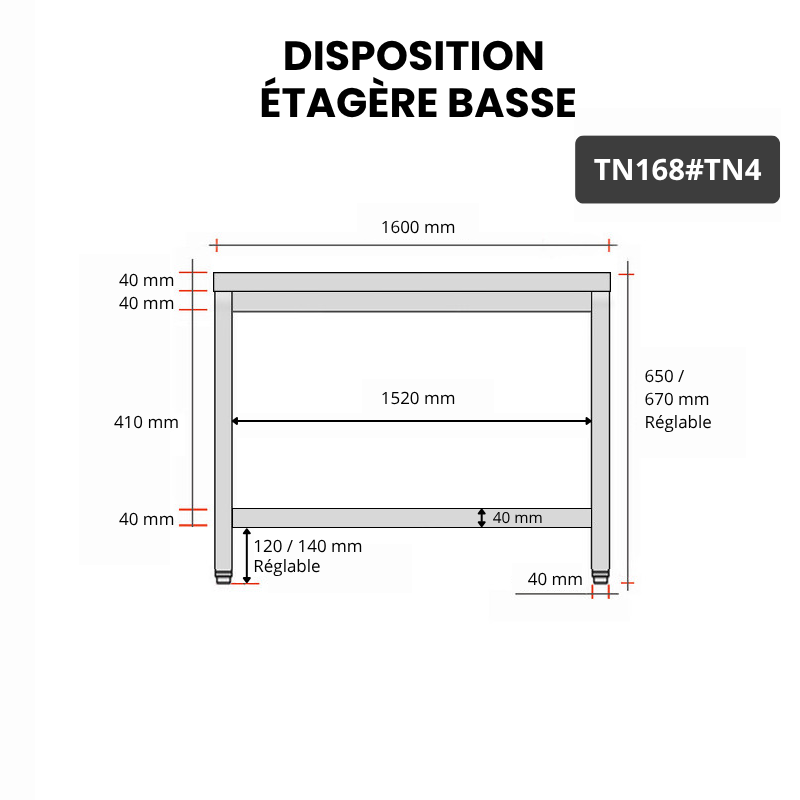 - Hauteur réglable pour les pieds : 660 à 680 mm