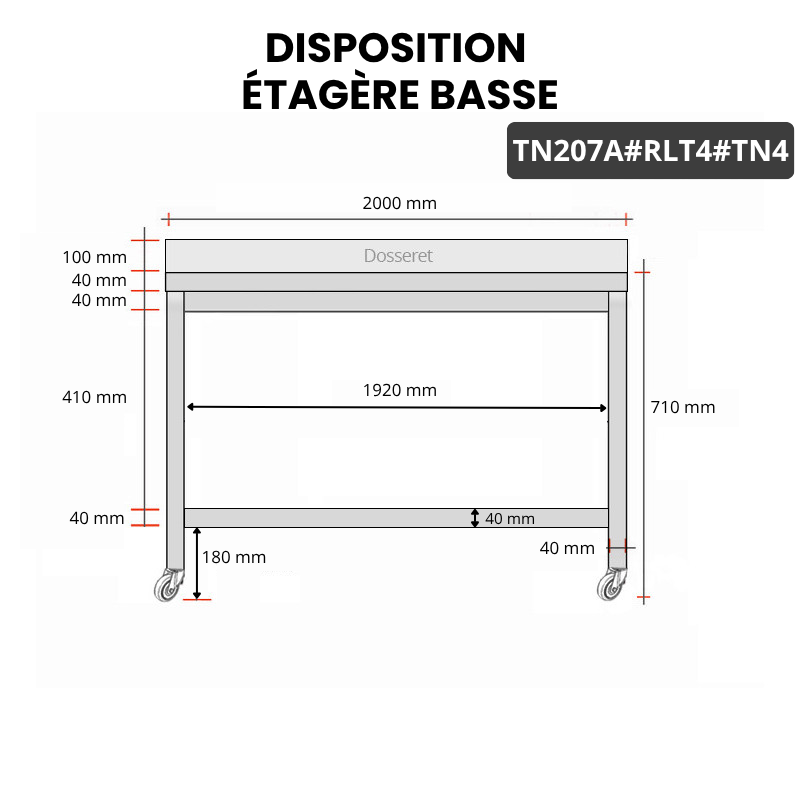 L'étagère inférieure offre un espace de rangement supplémentaire précieux pour vos ustensiles, équipements ou ingrédients, contribuant à l'organisation efficace de votre espace de travail. Cette fonctionnalité permet de maximiser l'utilisation de l'espace disponible tout en gardant les outils nécessaires à portée de main.