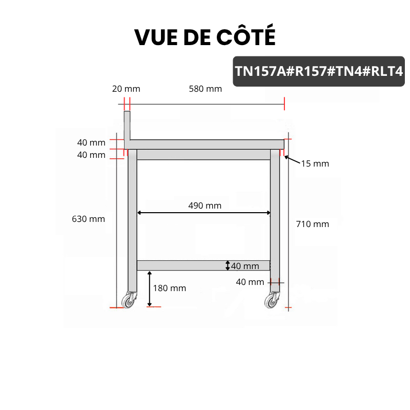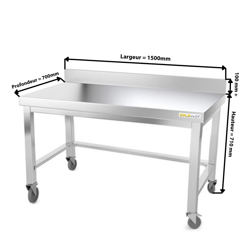 Table inox soubassement 1500 x 700 mm adossée avec renfort sur roulettes / GOLDINOX