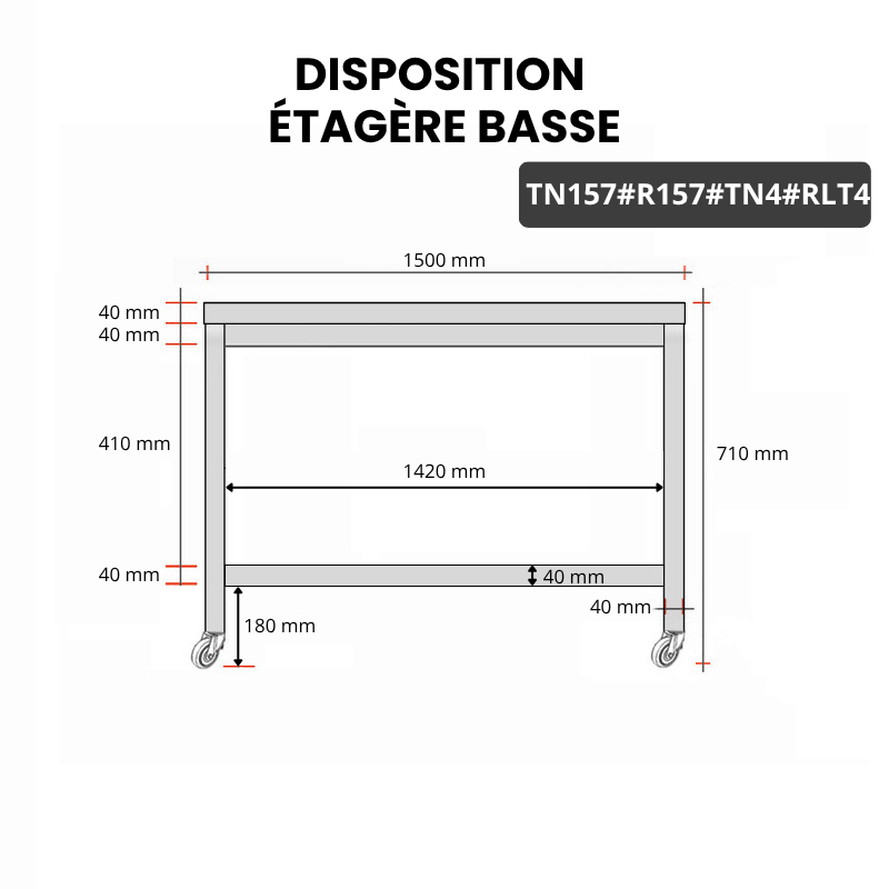 Table inox soubassement 1500 x 700 mm avec renfort sur roulettes / GOLDINOX