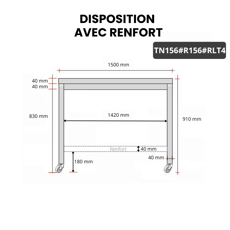 Table inox 1500 x 600 mm avec renfort sur roulettes / GOLDINOX