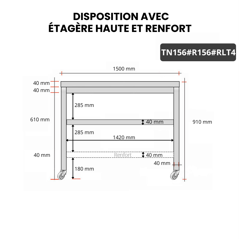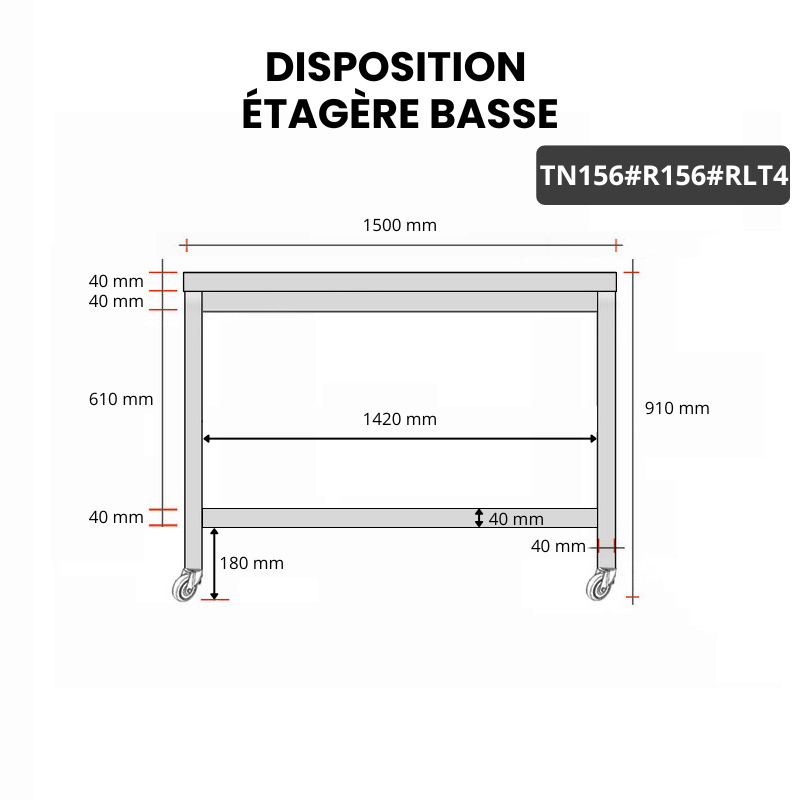 Dotée de 4 roues robustes dont 2 avec freins, vous aurez alors tout le confort d'une table inox mobile, permettant un déplacement de votre matériel sans effort.