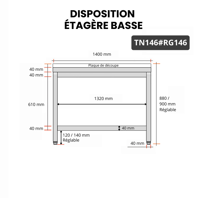 • Dimensions extérieures : 1400x600x880/900 mm (Largeur Profondeur Hauteur)
