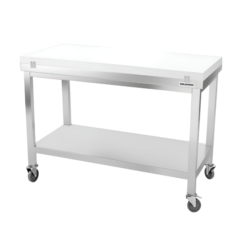 Table de travail en inox 1400x500 mm avec plaque de découpe blanche sur roulettes PREMIUM - GOLDINOX