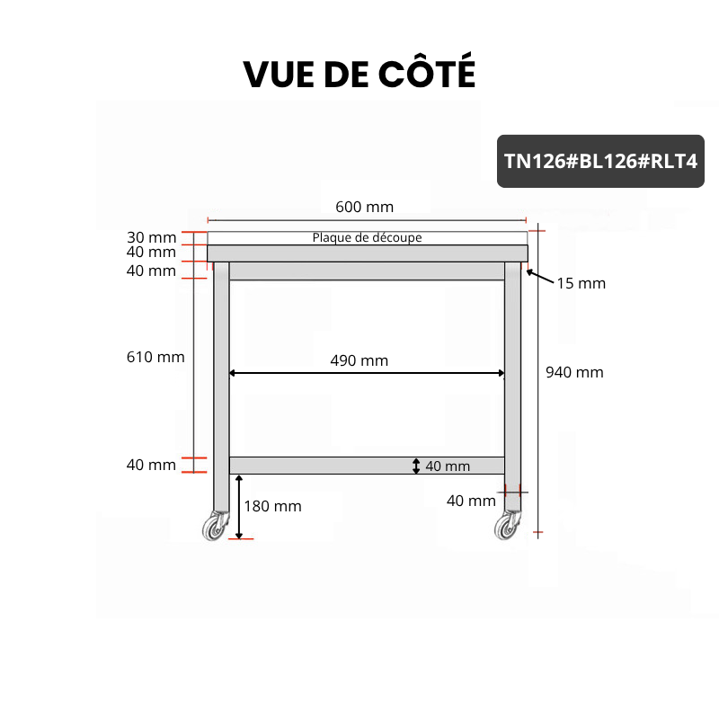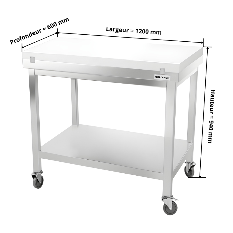 Table de travail en inox 1200x600 mm avec plaque de découpe blanche sur roulettes PREMIUM - GOLDINOX