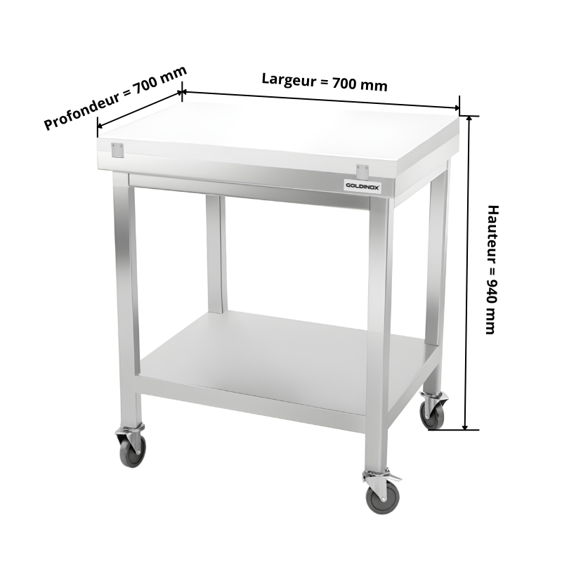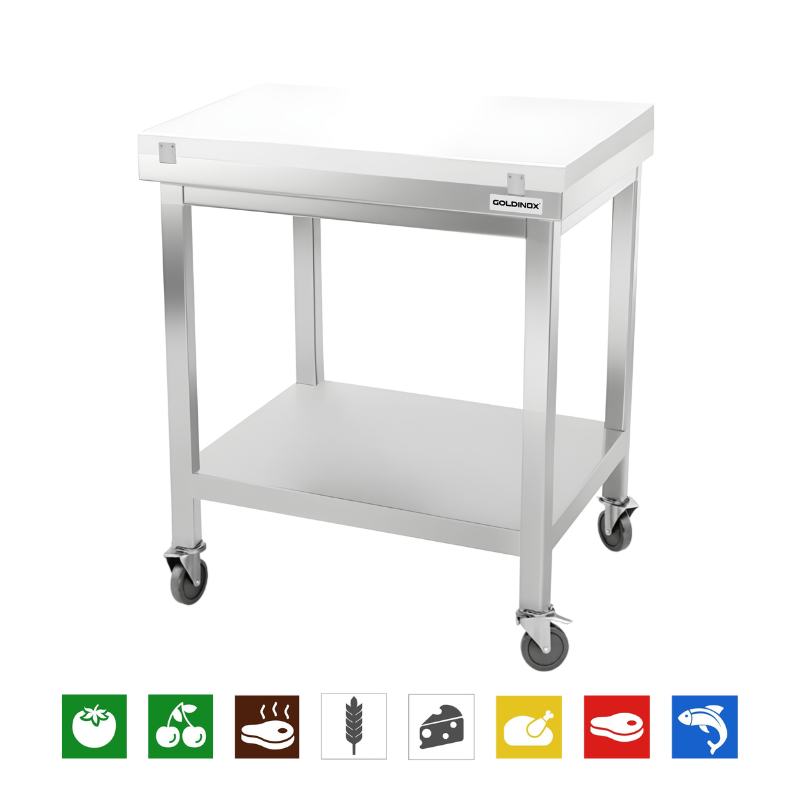 Table de travail en inox 700x700 mm avec plaque de découpe blanche sur roulettes PREMIUM - GOLDINOX