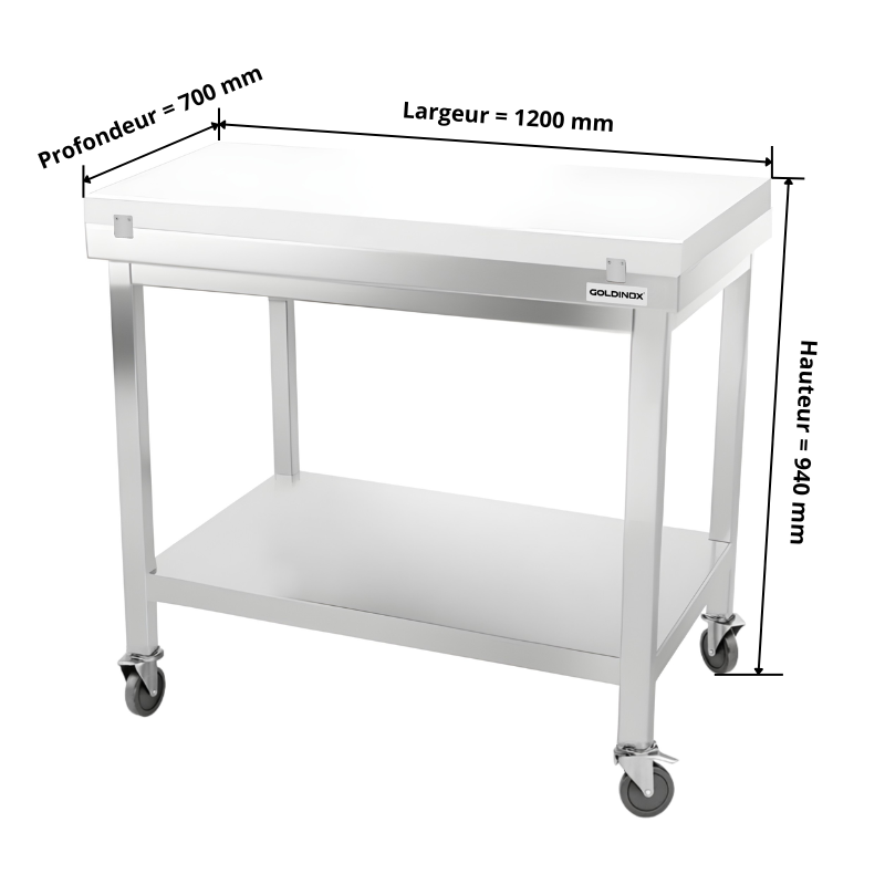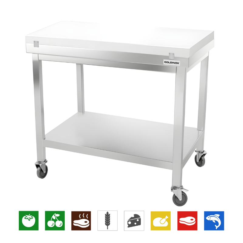 Table de travail en inox 1200x700 mm avec plaque de découpe blanche sur roulettes PREMIUM - GOLDINOX