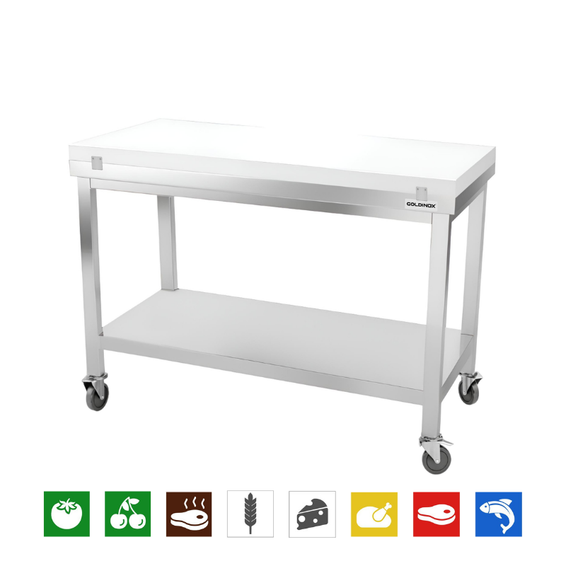 Table de travail en inox 1500x800 mm avec plaque de découpe blanche sur roulettes PREMIUM - GOLDINOX